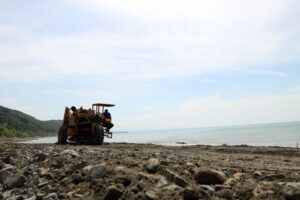 Ayrıca özel araçla kumsal temizliği yapılıyor. Bölgede nadir olarak kullanılan kumsal temizleme aracıyla taşlar temizleniyor, kumsal, çıplak ayakla yürümek isteyenler için cam kırığı gibi kesici materyallerden arındırılıyor.