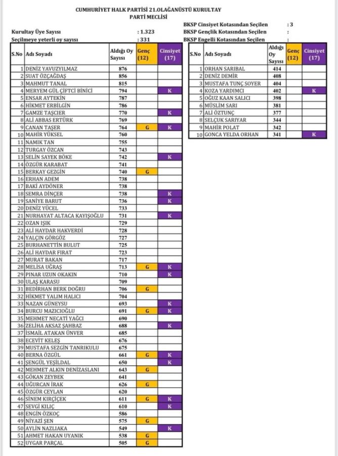 CHP’nin 21. Olağanüstü Kurultayı’nda, 60 kişilik Parti Meclisi (PM) ve 15 kişilik Yüksek Disiplin Kurulu (YDK) üyeleri belirlendi. Sabaha karşı sonuçlanan seçimde Zonguldak Milletvekili Deniz Yavuzyılmaz, delegelerin rekor oyuyla birinci sıradan seçilerek parti meclisine girdi. Delegelerin yüzde 82’sinin oyu olan 876 oy ile birinci sıradan parti meclisine girdi.