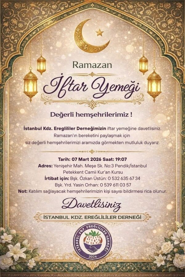 İstanbul’da yaşayan Kdz. Ereğlilileri bir araya getirecek anlamlı bir iftar programı düzenleniyor. İstanbul Kdz. Ereğlililer Derneği tarafından organize edilen iftar yemeği, Ramazan ayının manevi atmosferinde hemşehrilik bağlarını güçlendirmeyi amaçlıyor.