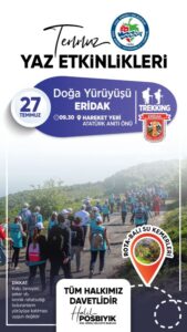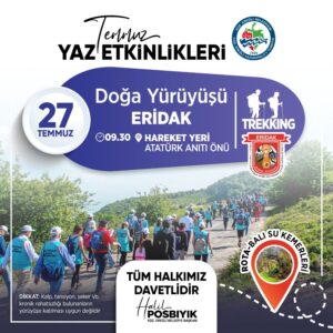 Etkinlikler Cumartesi sabah doğa yürüyüşüyle başlayacak. Belediye – Eridak işbirliğiyle Balı Su Kemerleri rotasında Trekkıng yürüyüşü yapılacak. Hareket yeri Cumartesi sabah saat 09.30’da Atatürk Anıtı önü olacak.