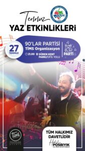 Cumartesi günü akşamı 90’lar partisi düzenlenecek. Tims Organizasyon işbirliğiyle Dürent Kent Parkı Süs Havuzu’nda saat 21.00’da 90’lar Partisi düzenlenecek.