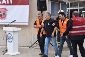 Belediye binasındaki tatbikat sabah saat 10.50’de sirenlerin çalmasıyla başladı. Belediye Başkanı Halil Posbıyık, sirenlerin çalmasıyla birlikte yardımcılarıyla binayı boşaltarak belediye önünde kurulan kriz masasına Başkanlık etti.