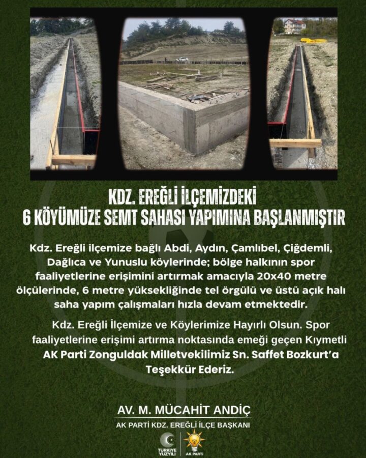 Kdz. Ereğli ilçesine bağlı Abdi, Aydın, Çamlıbel, Çiğdemli, Dağlıca ve Yunuslu köylerinde; bölge halkının spor olanaklarına erişimini artırmak amacıyla 20×40 metre ölçülerinde, 6 metre yüksekliğinde tel örgülü ve üstü açık halı saha yapım çalışmalarına başlandı.
