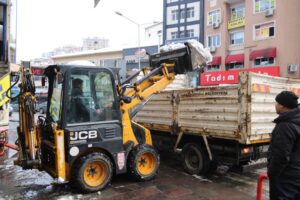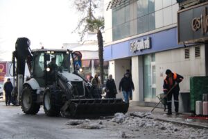 Temizlik İşleri, Fen İşleri ve Su Kanalizasyon İşleri Müdürlüğü ekipleri ellerinde küreklerle kaldırım ve yaya yollarını temizliyor. İş makineleri kentin 600 kilometrelik yol ağında temizlik çalışmalarına devam ediyor.