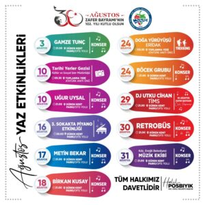 Ağustos ayında ayrıca 10 Ağustos’ta tarihi yerler gezisi, akşamında Uğur Uysal konseri, 16 Ağustos’ta 3. Sokakta Piyano etkinliği, 17 Ağustos’ta Metin Bekar konseri, 18 Ağustos’ta Birkan Kusay konseri, 24 Ağustos’ta doğa yürüyüşü, akşamında Böcek Grubu konseri, 29 Ağustosta DJ Utku Cihan, 30 Ağustos’ta ünlü grup Retrobüs ve 31 Ağustos’ta Belediye Müzik ekibi konser verecek.