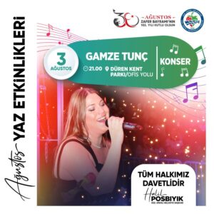 Kdz. Ereğli Belediyesi tarafından düzenlenen Yaz Etkinlikleri, Ağustos ayında da devam edecek. Cumartesi akşamı Gamze Tunç, sahildeki Düren Park Süs Havuzu’nda konser verecek. Belediye Başkanı Halil Posbıyık, etkinliklere Ereğli halkını davet etti.