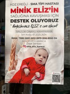 Kdz. Ereğli Kepez mahallesi, Prof. Muammer Aksoy caddesi, Tuncay Eczanesi, ve Mondi Home yanında kuaförlük yapan Erkan Mağul, SMA hastası Eliz Karaca bebek için bağış kampanyası düzenledi.