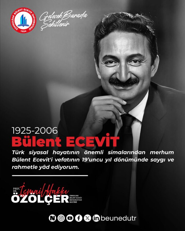 Zonguldak Bülent Ecevit Üniversitesi (BEUN) Rektörü Prof. Dr. İsmail Hakkı Özölçer, Türkiye Cumhuriyeti Başbakanlarından Bülent Ecevit’in vefatının 19. yıl dönümü münasebetiyle bir anma mesajı yayımladı.