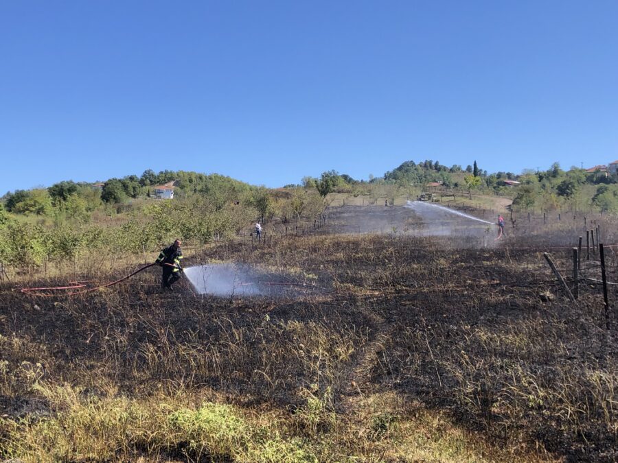 Olay, kuru otların tutuşmasıyla hızla yayılmaya başlayan yangın, rüzgarın da etkisiyle komşu arazilere sıçrama riski oluşturdu.
