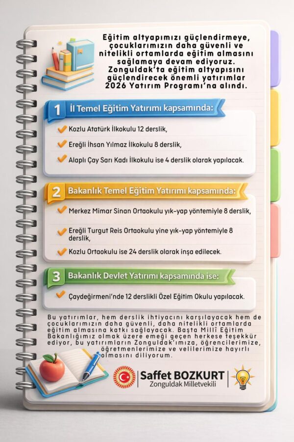 Eğitim altyapımızı güçlendirmeye, çocuklarımızın daha güvenli ve nitelikli ortamlarda eğitim almasını sağlamaya devam ediyoruz. Zonguldak’ta eğitim altyapısını güçlendirecek önemli yatırımlar 2026 Yatırım Programı’na alındı.